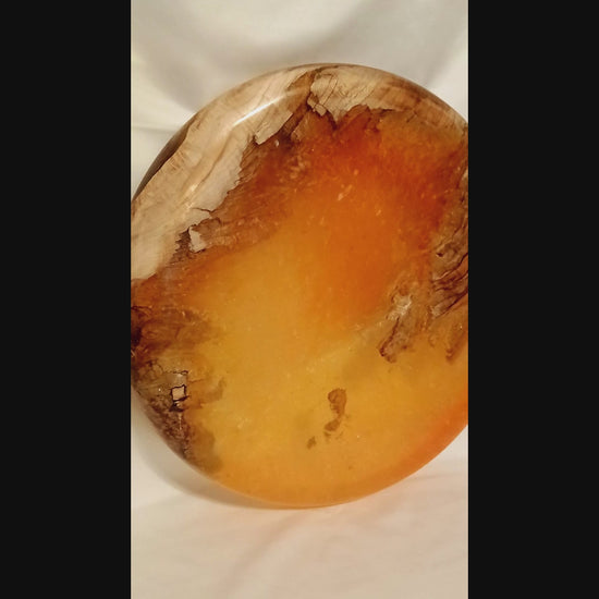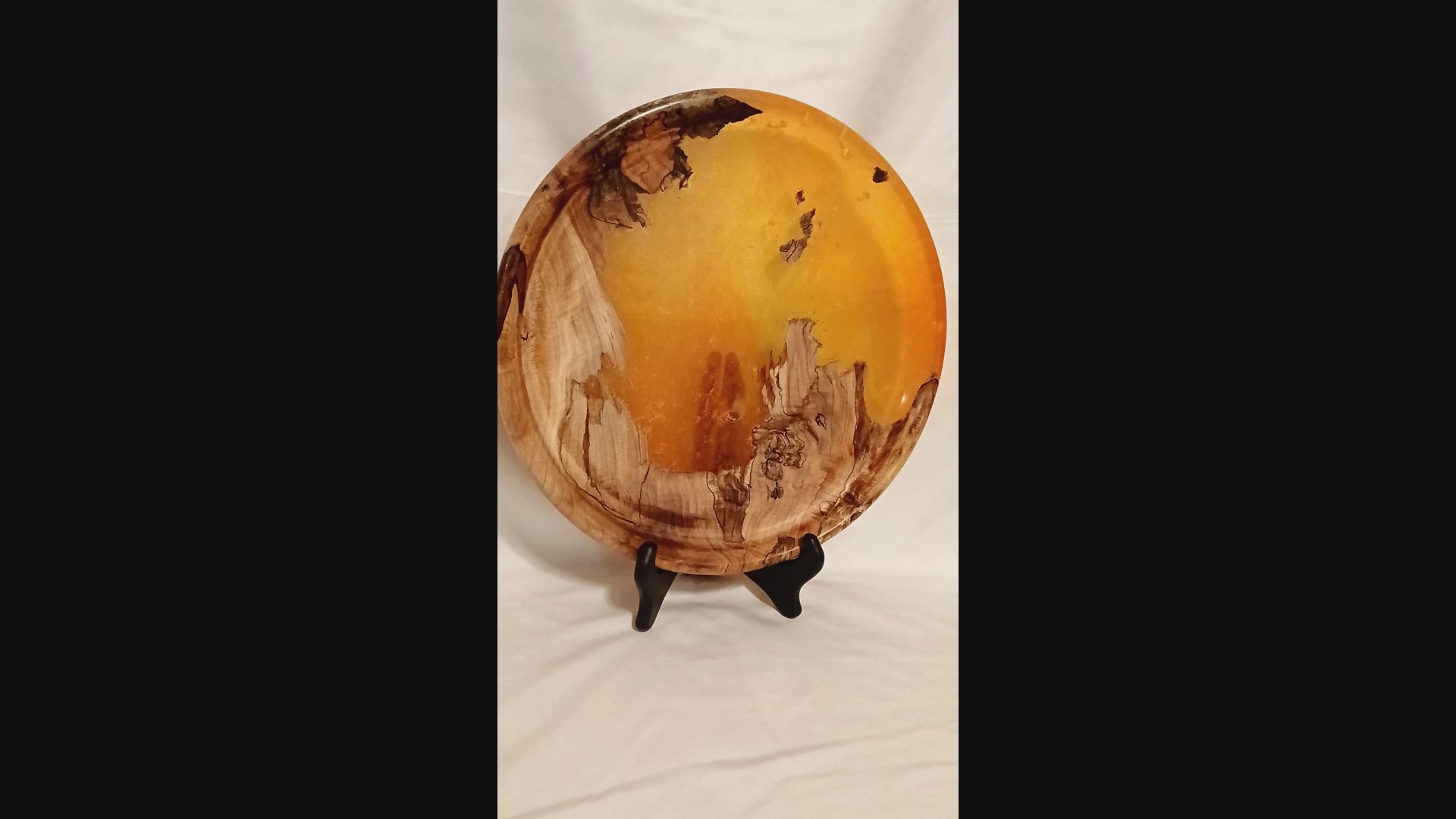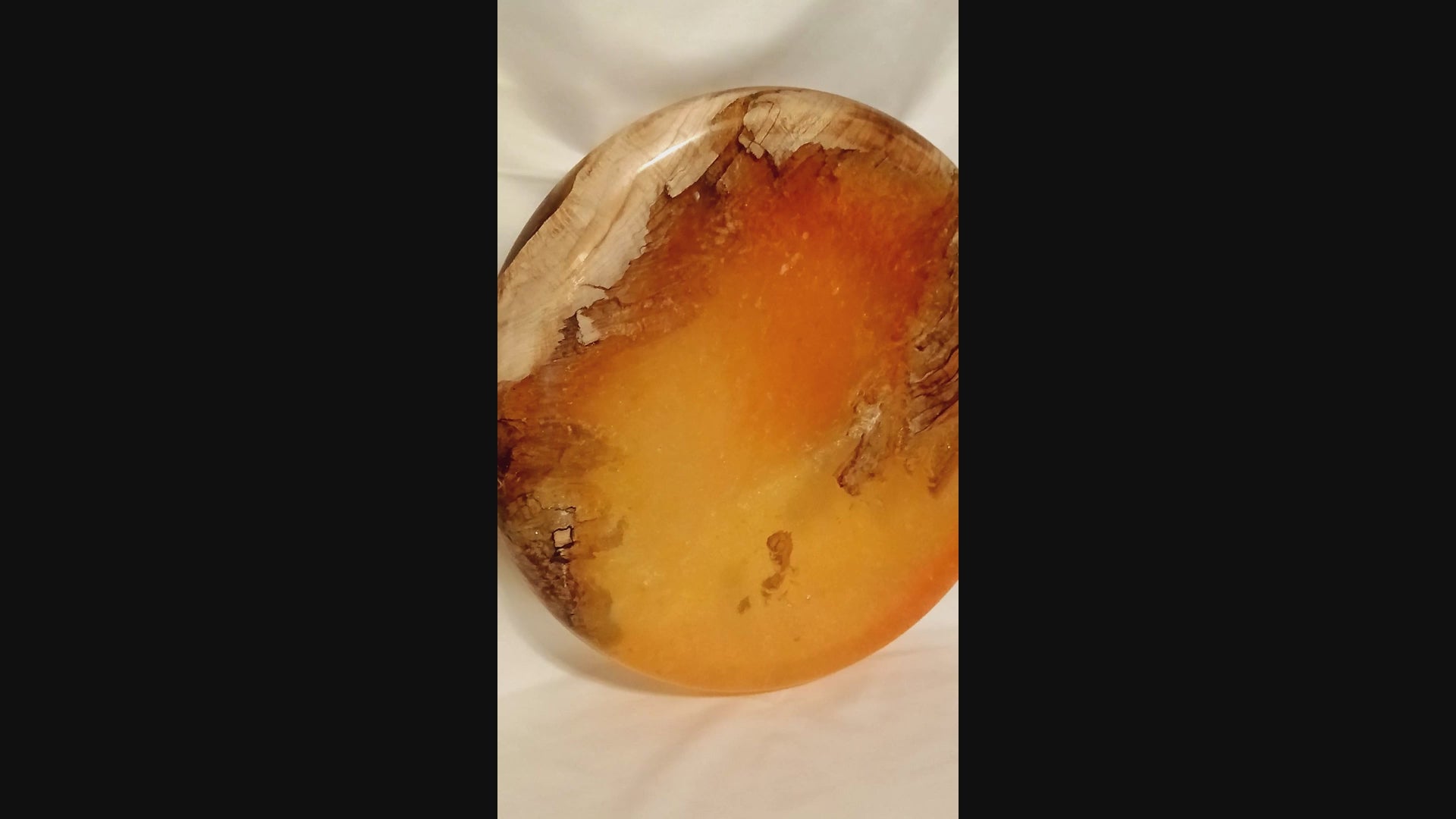 There is so much character to this piece. Mixtures of colors and textures give way to deep yellows and meld together with the natural spalted figuring in the wood grain . With over a 38” circumference, this is the largest plate I’ve created yet. Made from, spalted, big leaf Maple with orange and yellow resin accenting the bottom and the sides. This gorgeous piece will be the centerpiece in any room.