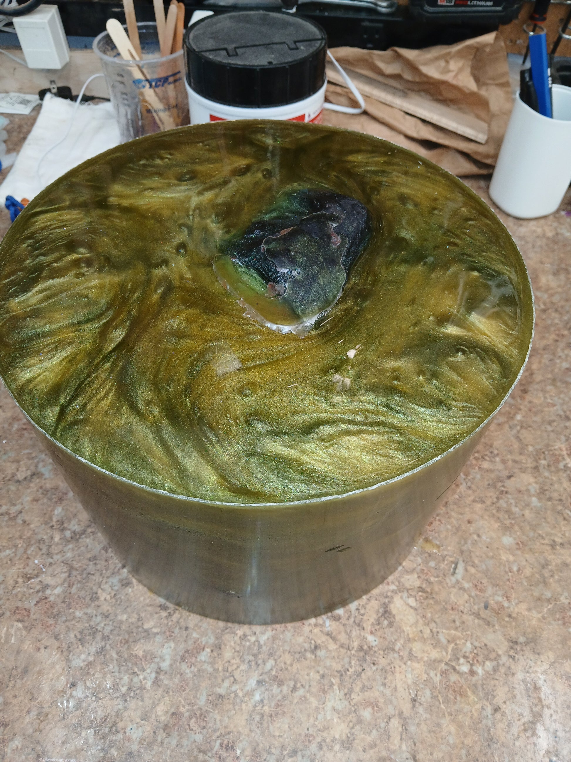 Completing the look are pockets of shimmering mica that settled into the live edge during casting, helping to enunciate the iridescent effect and adding another layer of definition.