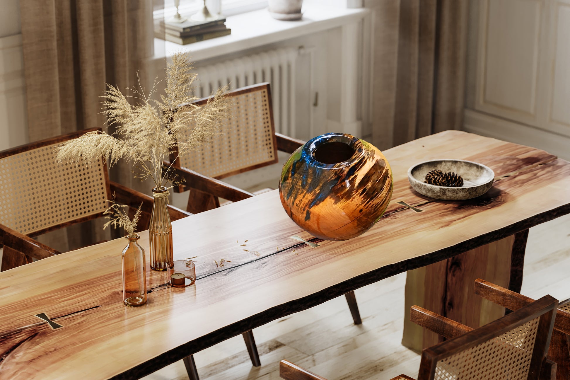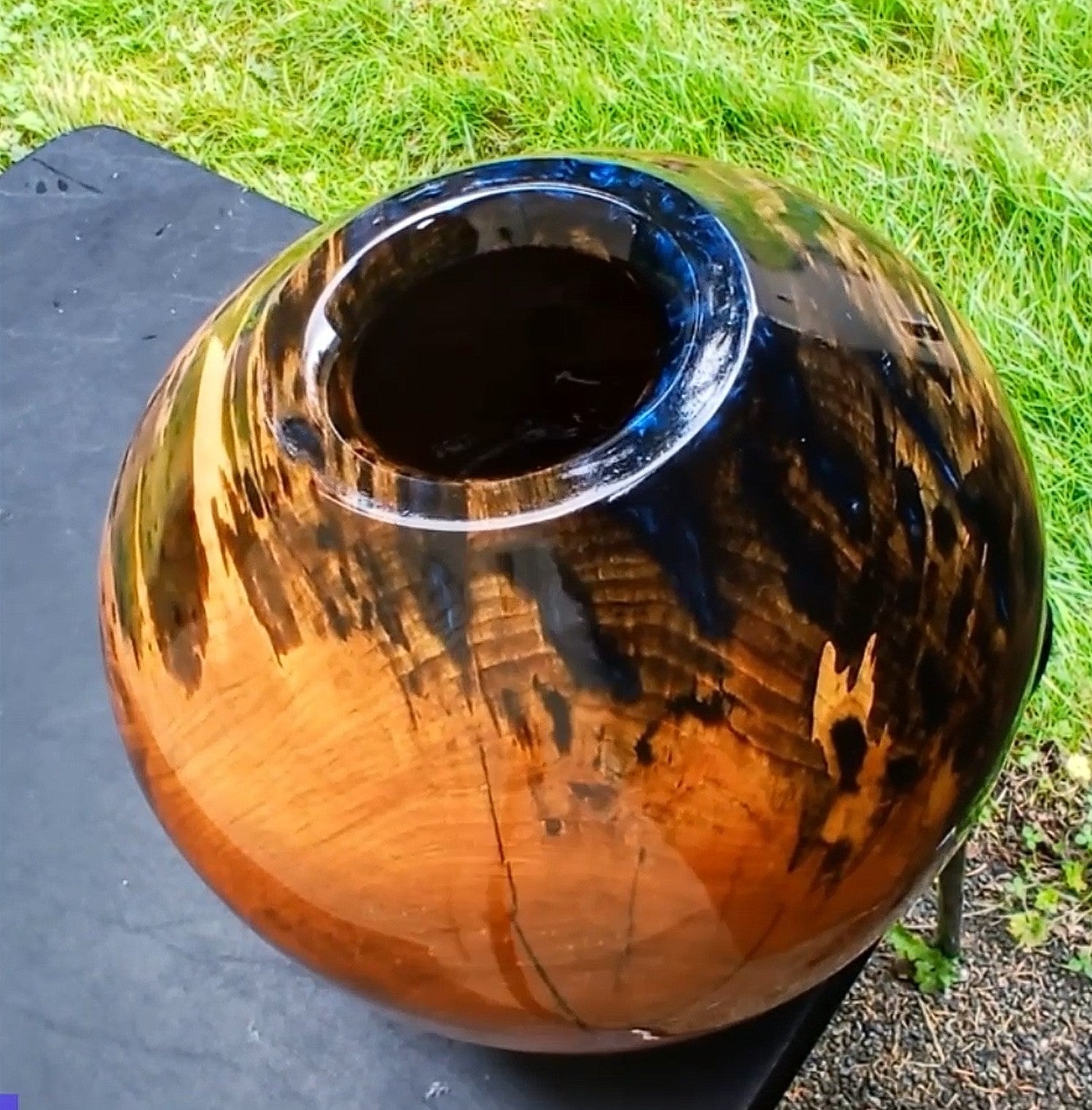With a 37” circumference, this is the largest hollow form I’ve created yet. Meet Katanga. Made from stabilized, spalted, big leaf Maple with deep cobalt blue resin accenting the rim and the sides. This piece is named after the largest cobalt mining region in the world. There is so much character to this piece. Striations of deep black give way to deep blue and meld together with the natural figuring in the wood grain. Turning it slightly you view the radiant lines emanating from the center. Turning slightly more shows you layer upon layer of beautiful figuring. This gorgeous piece will be the centerpiece in any room. Standing almost 12” tall this piece started out at 45 lb. after being cast and before starting. Completed weight ended up being a little under 12 lb. after almost 100 hours of labor. The internal walls average 3/8” thick and has a resin finish on the inside. While the outside has an oil topcoat over resin.