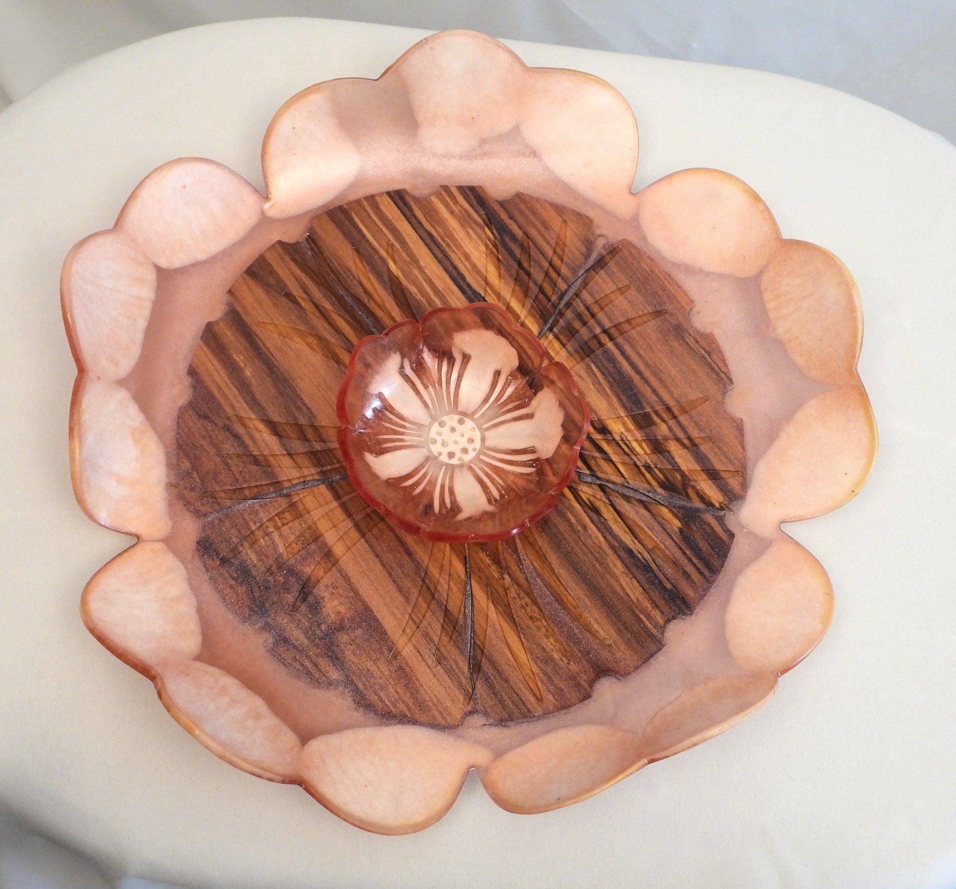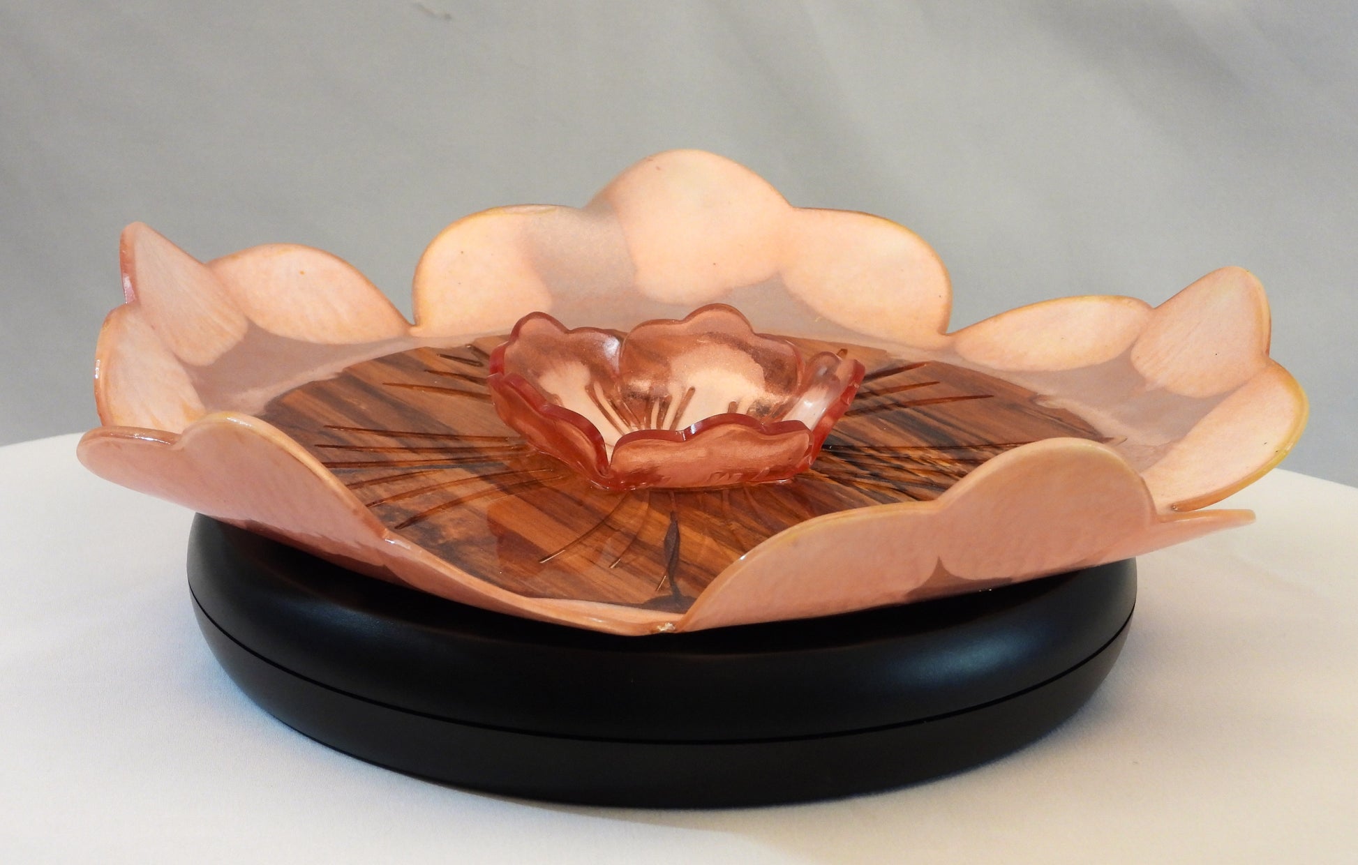 Petals started as a prototype to create a new type of woodturned and resin functional art. Crafted from spalted Western Red Alder and resin. The alder plate was first turned on the lathe and then cast in the resin mold. The resin cast was a two step process that resulted in the defining pink and white colors. The plate was then painstakingly formed by hand creating this very unique piece.
