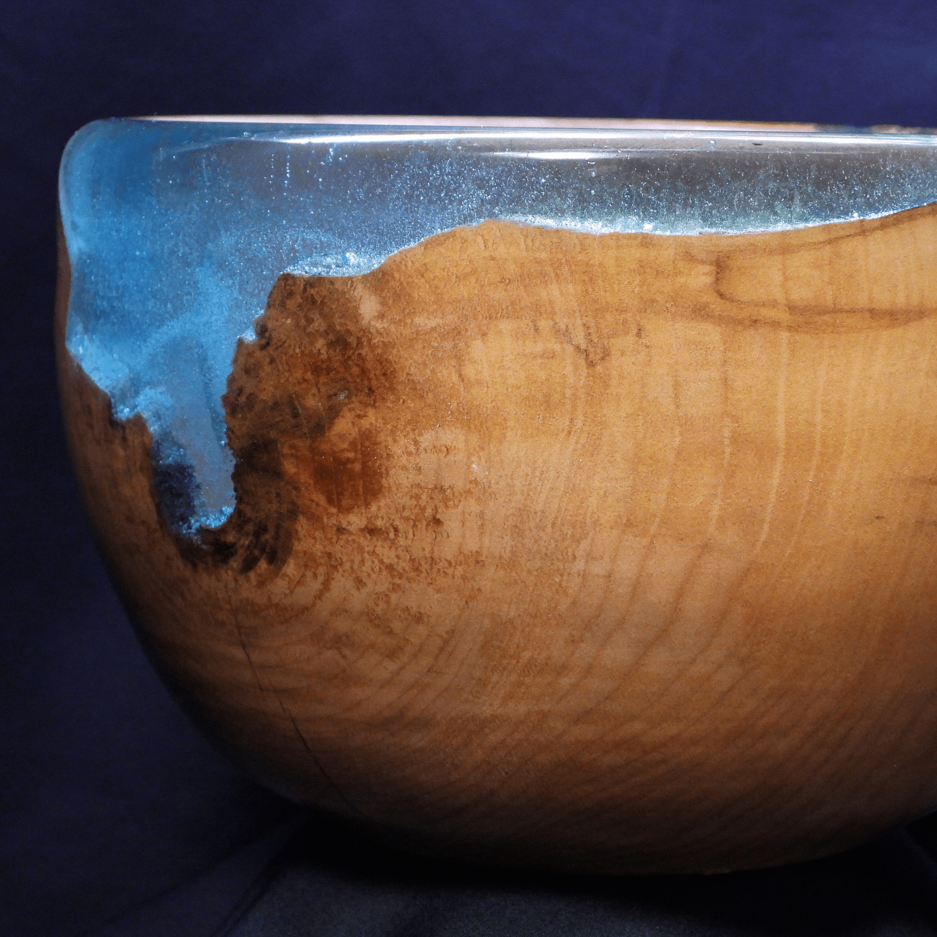 Waterfall is a big leaf western maple burl bowl, with translucent, turquoise resin dominating the natural edge rim and falling down the front side. You can almost feel the cold, turquoise water cascading down the side of the cliff. The reverse side is just as beautiful with shimmering chatoyance on both the side and the bottom.